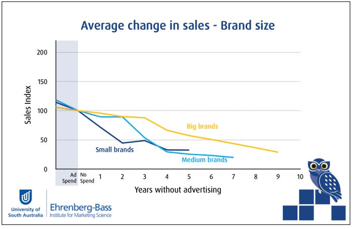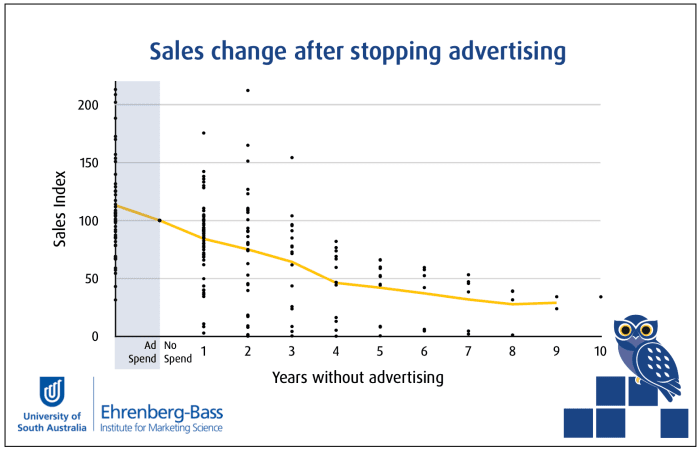 最近在网上传播的另一项研究是由澳大利亚Ehrenberg-Bass Institute(EBI)进行的题为“当品牌变黑”的作品。作者收集了来自酒精饮料品牌的57个案例的样本,这些品牌关闭了广告并在此后几年的销售量下降。以下图表很好地说明了这一点: