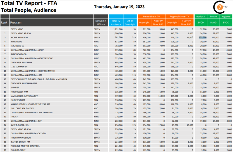 在1月19日最新的每日综合电视总报告中,Seven News是全国排名第一的节目,有129.1万观众,其中BVOD有3.2万观众,上升了3%。