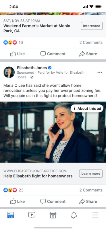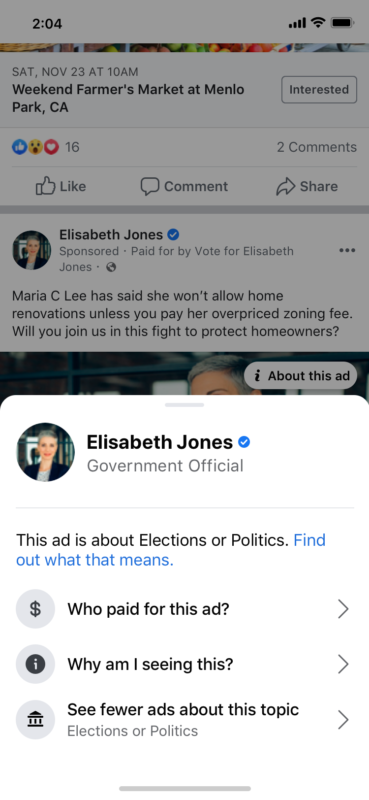 用户也可以通过点击信息流中这些广告的顶部来打开该控件,我们将停止向他们展示包含免责声明的有关社会问题、选举或政治的广告