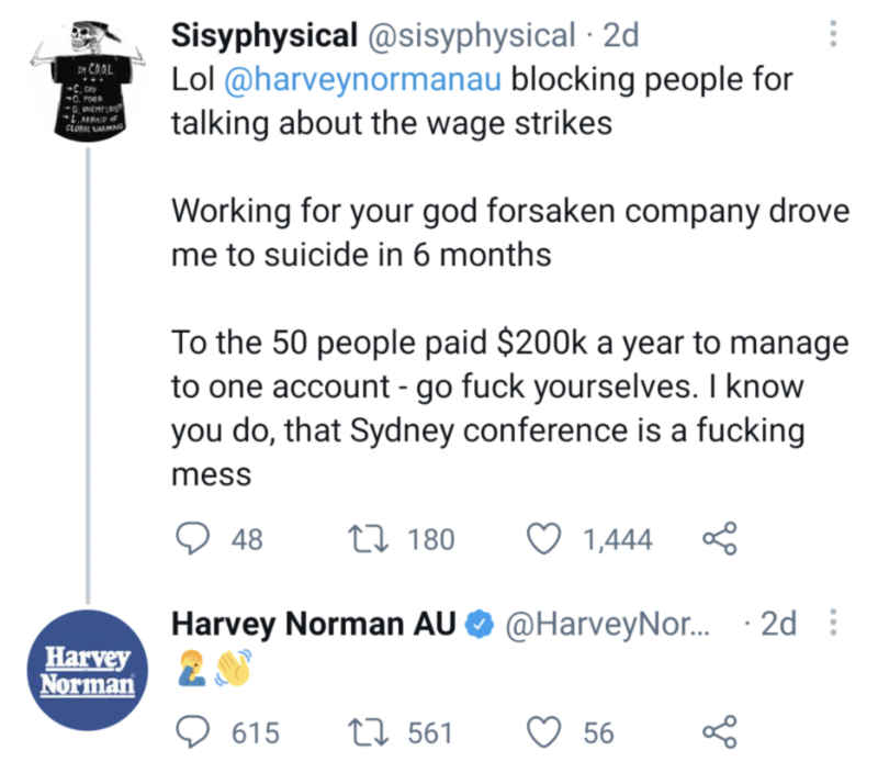 哈维·诺曼在创始人Gerry Harvey揭示了纳税人支付的工作员资金后,哈维诺曼已经受到负面媒体的主题,尽管公司利润在大流行期间增加了116%,但业务将不会返回纳税人支付的工作基金的1450万美元。该新闻触发的员工抗议活动爆发了全国各地的哈维诺曼商店,作为不满的员工要求工资随着公司在大流行期间的纪录盈利增长而增加。