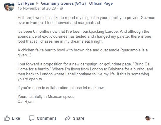 去年11月的一个周三晚上当劳拉·托姆(Lara Thom)熬夜浏览Facebook时,一个帖子吸引了她的眼球。这封邮件来自21岁的卡尔·瑞安,他来自昆士兰州的奥尔巴尼溪,在英国旅游行业工作。他曾写信给Thom担任首席营销官的Guzman y Gomez,抱怨在澳大利亚以外的地方缺少餐厅。“这是一封非常厚颜无耻的邮件,”劳拉在Facebook的Face 2 Face播客上对Jules Lund说。“它表达了他对在伦敦买不到GYG玉米煎饼的厌恶。”