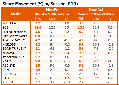 SmoothFM周一至周日的观众份额增加了1.6个百分点,达到9.9%,WSFM的份额下降了1.4个百分点,至7%,使澳大利亚广播电视网的节目在总体上排名第四。