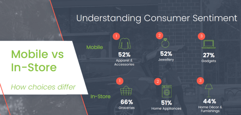 E-gadgets、珠宝和服装和配件是通过移动设备类别最有可能购买,虽然杂货,家电和家居装饰或家具将最常购买店内。