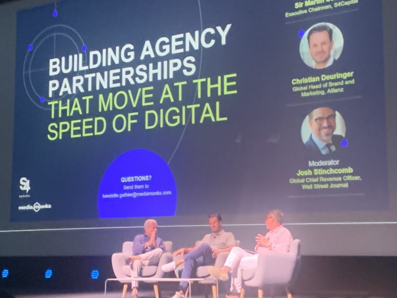 此前一天,索瑞尔与相对较新的客户安联(Allianz)的全球品牌和营销主管杜林杰(Christian Deuringer)一起出席了一个名为“建立以数字化速度发展的代理伙伴关系”的会议。安联将是索瑞尔所说的“巨无霸”客户之一,目前有8家,另有19家已被“确定”。