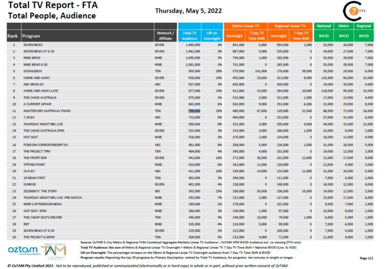 在5月5日的最新每日整合电视报告中,七个新闻以14.85亿电视观众的名字榜首,其中包括33,000名BVOD的观众,增长了3%。最高兴奋的计划是TEN的MasterChef澳大利亚,占29%,并由796,000个国家观众观看。