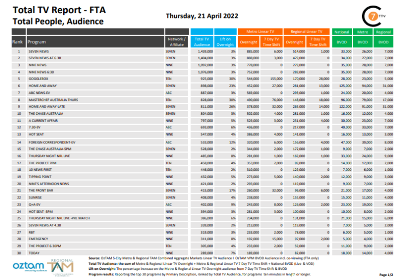 在4月21日最新的每日综合电视总报告中,Seven News是全国收视率最高的节目,有143.9万观众,其中BVOD有3.3万观众,上升了3%。涨幅最大的节目是Ten的《Gogglebox》和《MasterChef Australia》,涨幅均为30%。《Gogglebox》吸引了92.5万名电视观众,BVOD吸引了2.8万名观众,而《Masterchef Australia》吸引了82.8万名电视观众,BVOD吸引了9.6万名观众。