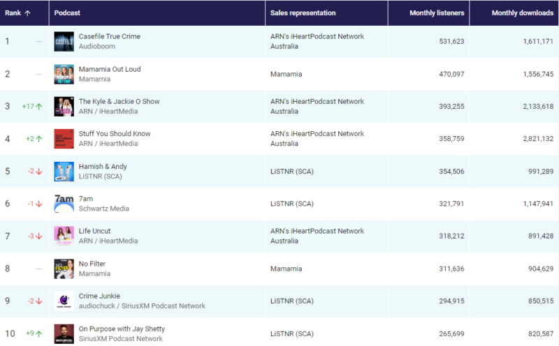 播客出口看到每月531623听众和每月1611171下载。是紧随其后的是Mamamia Mamamia大声,有470097听众和1556745下载18集。