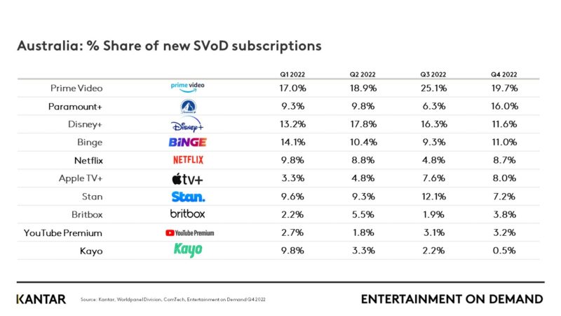 根据凯度的数据,亚马逊Prime视频和派拉蒙+在订阅视频点播(SVOD)服务中吸引新用户方面领先,分别占2022年第四季度新用户的20%和16%。