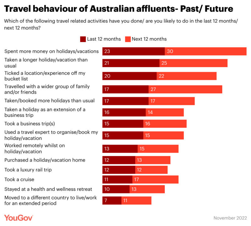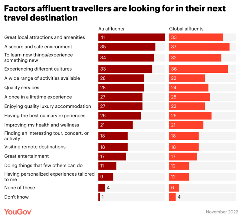YouGov《2023年全球旅游和旅游白皮书》的新研究发现,对接受调查的36%的澳大利亚人来说,自疫情以来,旅行对他们来说变得更加重要,而在富裕消费者中,这一比例为59%。