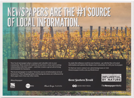 该竞选活动是根据研究的调查结果开发的“思想本地 - 区域新闻报道”,其中显示77%的受访者发现区域报纸是当地社区,商业和服务信息中最有价值的源头。