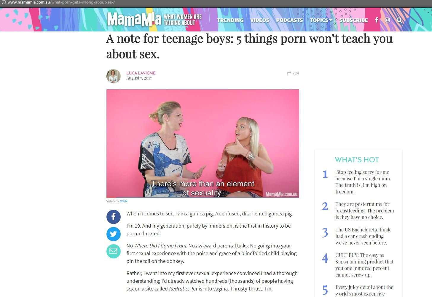 因此,当他在Facebook上看到米娅·弗里德曼19岁的儿子卢卡·拉维尼写的一篇题为《妈妈妈妈》的专栏时,他既高兴又好奇“色情片教给你的关于性的5件事”- Mumbo博士立即转发了一篇文章给他的老师朋友,以防他们在PDHPE期间打电话,为了简洁起见使用了x级材料。