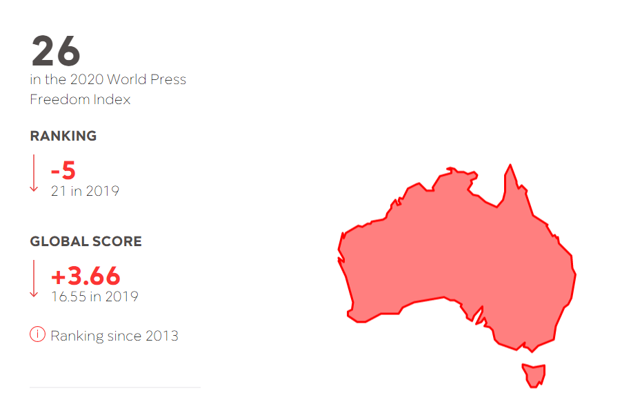 “In 2019, Australian journalists became more aware than ever of the fragility of press freedom in their country, whose constitutional law contains no press freedom guarantees and recognizes no more than an ‘implied freedom of political communication’,” read the report accompanying the data.