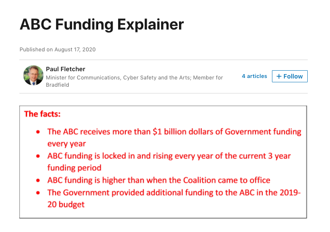 ABC站在从其事实检查单元报告结论性的通讯部长保罗·弗莱彻(Paul Fletcher)在他的主张中误导了广播公司的资金正在增加,而不是减少。