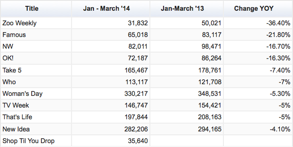 《太平洋杂志》(Pacific magazine)旗下的名人杂志《谁》(Who)在名人周刊中跌幅最小,下降了7%,发行量从去年1月至3月的121708份降至113117份。