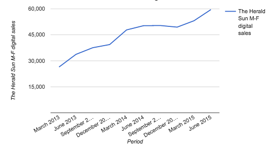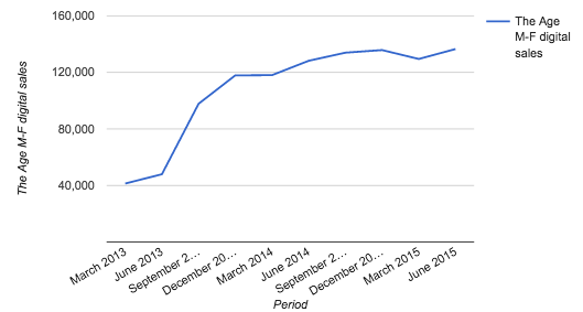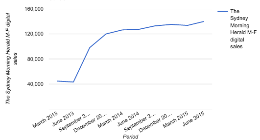 这是一个类似的情况在《悉尼先驱晨报》,然而今年工作日数字潜艇上升了近10%,而工作日打印订阅下降了12%。周六打印订阅下降了9.4%,而潜艇打印到掌握下降了13.9%。