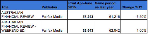 然而,尽管国家商业报纸《澳大利亚金融评论下降了6.5%在工作日,周末版是唯一一个把正增长- 1%提高其发行量601册至62643。