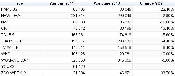根据审计局(ABC)的最新数据,在2014年4月至6月的最新数据,ZOO每周持续最严重的击中,发布下降33.70%。