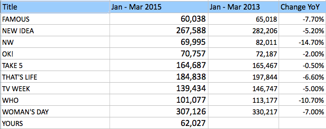 太平洋杂志(Pacific Magazine)的《那就是生活》(That 's Life)销量下降了13006册,至184838册,比2014年前三个月下降6.6%。