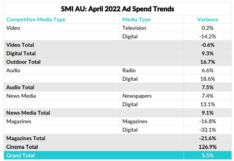 她说:“距离联邦选举还有一个月的时间,我们一直期待看到与选举相关的广告支出大幅增长,今年也不例外,SMI报告称,政府和政党/协会/工会产品类别的预订量同比大幅增长,与2021年4月相比,每个类别的价值分别增长了83.5%和309%。”