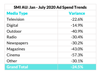 编制这些数据的标准媒体指数(SMI)表示,8月初的数据看起来又有所好转,在还有三个交易日的情况下,不包括数字媒体在内的数据恢复了25.2%,这要归功于广告商在8月份的支出超过了整个7月份。