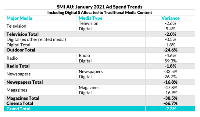 由于Covid-19,一项重大因素是澳大利亚开放到2月的移动,而电视则会产生重大打击,预订减少了-5.3%,总计花费低于-2%。