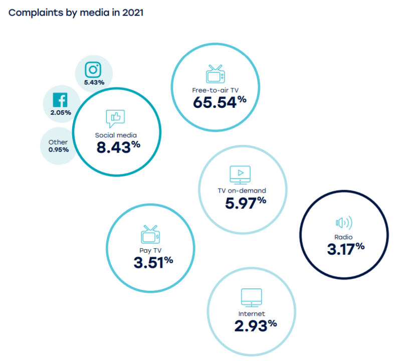 就吸引最多投诉的媒介而言,在免费到空中电视上播出的景点近三分之二,但这是过去几年的下降,从2019年的71%下降,2020年下降了66%。