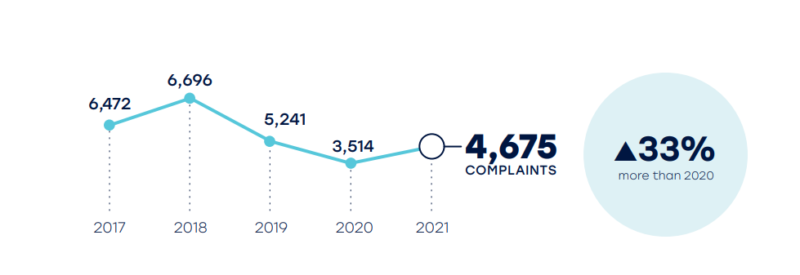 社交媒体上的投诉数量不断增长,构成了2021年超过8%的投诉,Instagram是对平台的最多抱怨,其次是Facebook。