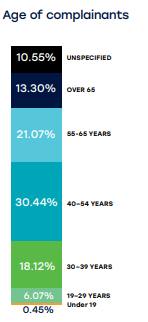 从年龄看,大约四分之三的投诉是由40岁以上的人提出的,其中30.4%的投诉人为40至54岁。在55至65岁的年龄段中,人们又有21.07%的投诉是归因于30至39年的18.12%。
