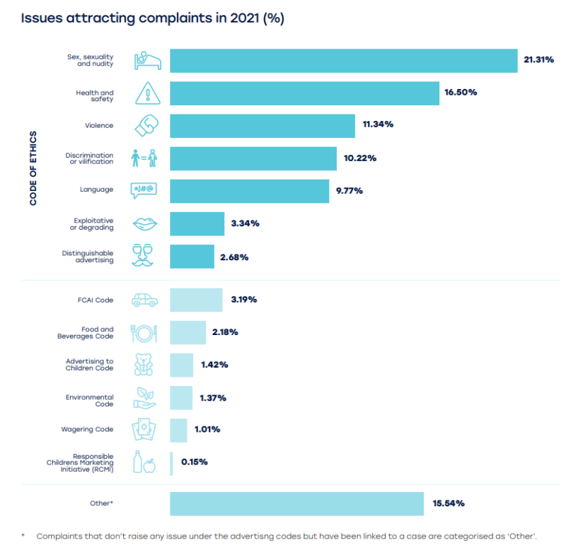 根据该组织的2021年《运营报告》,性别,性和裸露是最重要的关注,尽管略微下降到所有投诉的21.31%,而在2020年中,但占据了AD标准的最大关注。