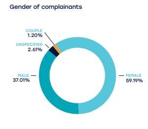 在性别方面,近60%的投诉是由女性提出的,男性已有37%的投诉,其余的夫妇或未指定性别的人提出的投诉。