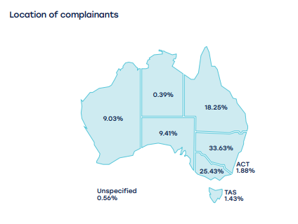 大多数投诉分解了对广告标准提出投诉的人的人口统计,其中所有投诉均在东部各州进行,其中33.63%来自新南威尔士州,维多利亚州为25.43%,昆士兰州有18.25%。