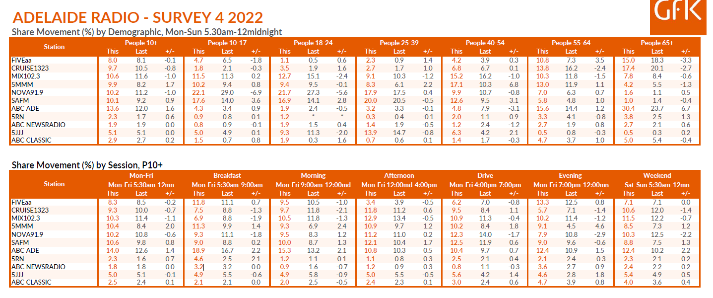 三米阿德莱德是最大的推动者在阿德莱德第四GFK电台评级调查,声称总体份额和最高的跳开槽。
