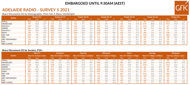 尽管阿德莱德没有受到封锁的重大影响,但听众转向AM的趋势仍在继续。ABC是整体变化最大的,上升了2.4个百分点,份额为12.2%,排名第二,而AM同行FIVEaa下降了2个百分点,份额为10.3%,排名第三。