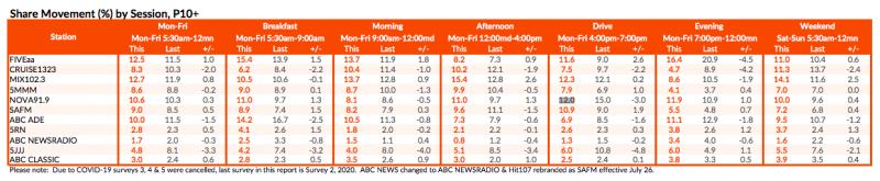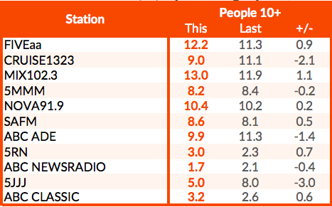 Mix仍然是表现最好的阿德莱德广播电台,占13%的份额,其次是相对稳定的5个AA(12.2%,增长0.9个百分点)和Nova(10.4%,增长0.2个百分点)。
