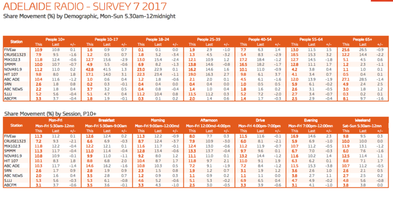 在FM频道,MIX102.3的Jodie and Soda的早餐节目赢得了0.1分,获得了12.2%的观众,击败了5MMM的Roo和Ditts,他们再次下滑,这次是0.4分,以11%的份额结束。