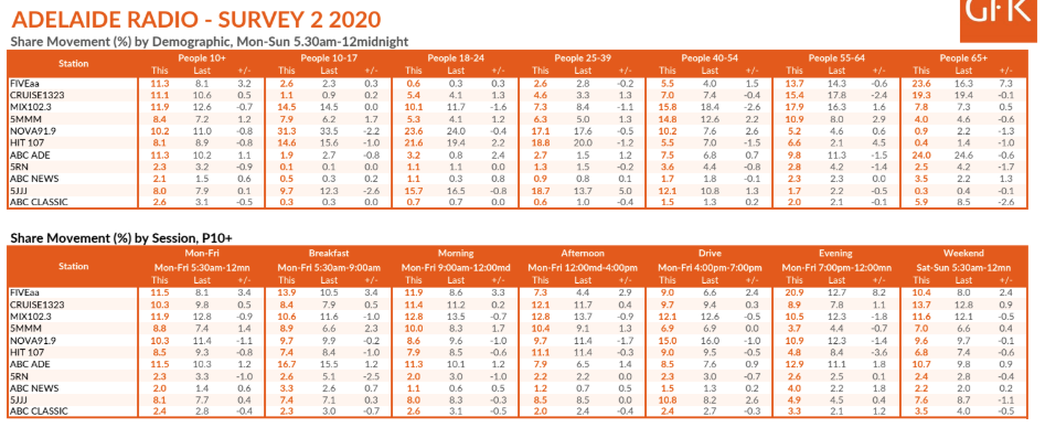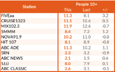 五AA的大卫Penberthy和将在阿德莱德古丁跃升了3.4的主要早餐槽爬到第二个以13.9%的份额,在ABC阿德莱德阿里·克拉克的16.7%。