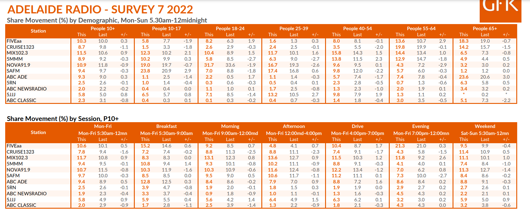 Triple M吸引了10.8%的份额,是上升幅度最大的(1.4个百分点)。紧随其后的是Nova 91.9的Ben & Liam,其份额为10.3%,是下降幅度最大的公司(1.6个百分点)。