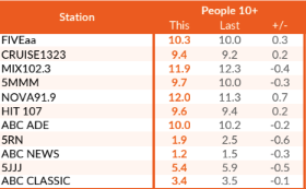排在第三位的是Five AA,上升了0.3个点,占10.3%的份额,然后是ABC阿德莱德,占10%。澳大利亚广播公司的阿德莱德国家广播电台跌幅最大,下降了0.6个百分点,份额为1.9%。
