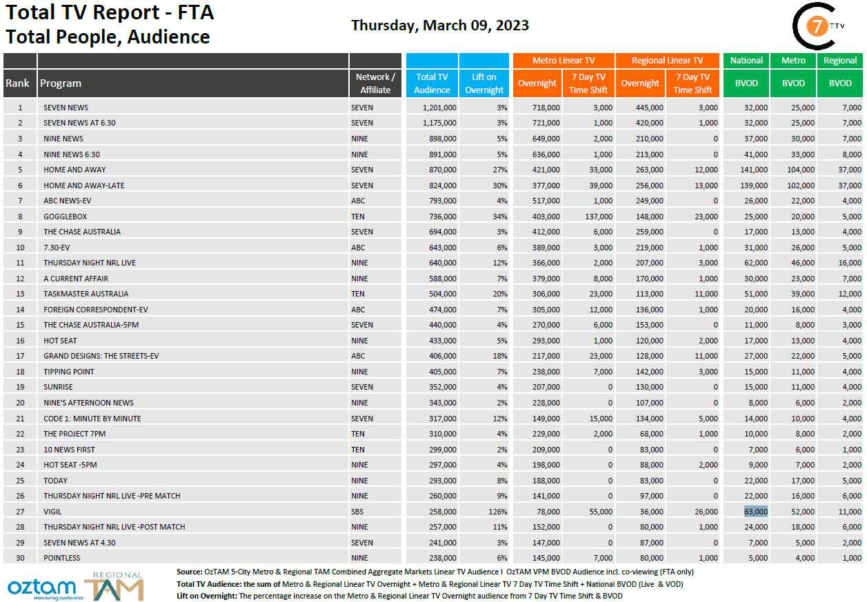 在3月9日最新的每日综合电视总报告中,Seven News上周四以120万电视总观众成为全国第一,其中包括32000名BVOD观众,同比增长3%。