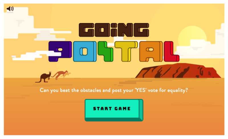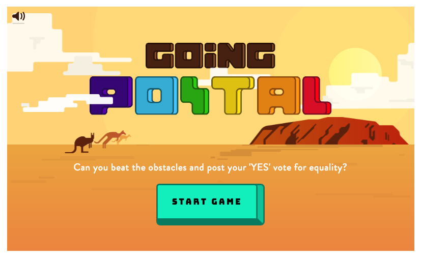 的游戏,去邮政”,是一个运行游戏,参与者面临的挑战是确保信封和彩虹路避免婚姻平等的许多障碍张贴他们的选票。