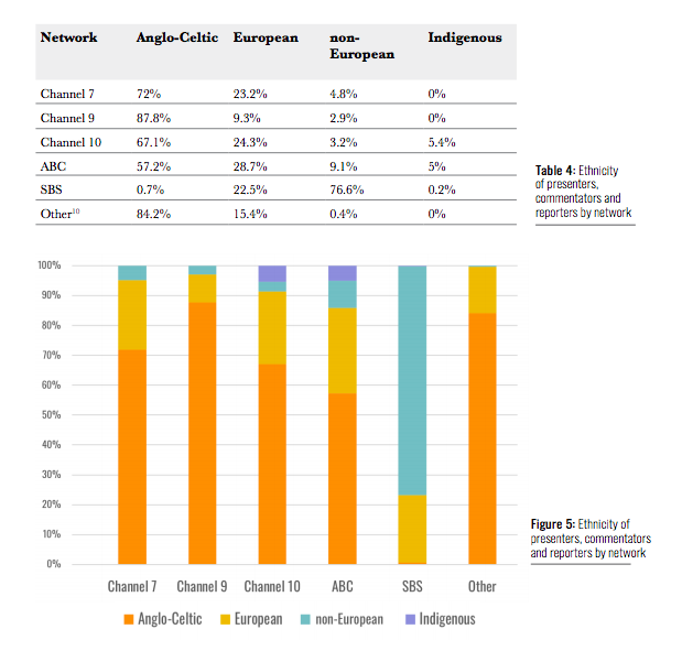 报告显示,超过75%的主持人、评论员和记者是盎格鲁-凯尔特人,只有6%的人有土著或非欧洲背景。在免费广播网络的39名董事会成员中,SBS只有一人有土著背景,另有三人是非欧洲背景。