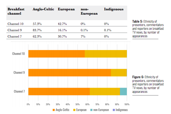 Ten的分类是67.1%的盎格鲁-凯尔特人,8.6%的非欧洲或土著。Seven只有4.8%的主持人、评论员或记者是非欧洲人。在该网络的这些职位上,72%的人被记录为盎格鲁-凯尔特人,没有土著人。