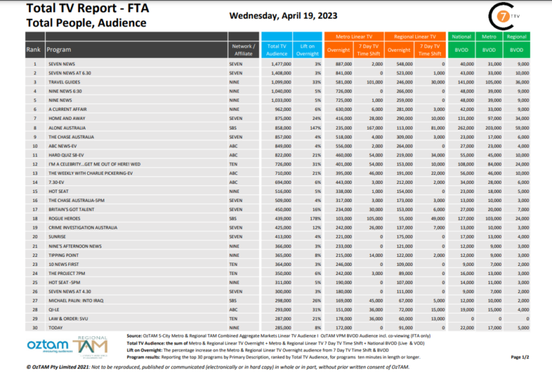 最近每天巩固7总电视报道4月19日,七新闻# 1程序上周二全国电视观众总数为147.7万,其中包括40000 BVOD和3%的提升。