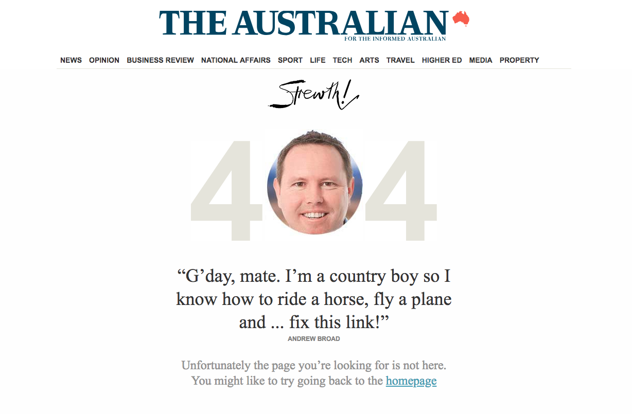 布罗德现在也不例外,《澳大利亚人报》很快就利用他来娱乐失去的读者。最新的404信息是:“你好,朋友。我是个乡下男孩,所以我知道怎么骑马,开飞机,还有……修好这个链接!”