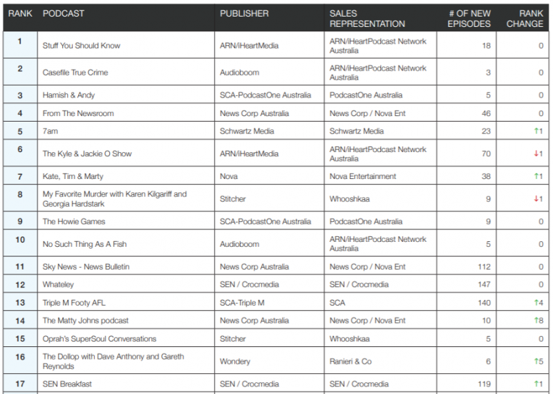 As for the All-Australian Top 100, seven new entities appear this reporting period, including Somehow Related with Dave O’Neil & Glenn Robbins (ARN/iHeartMedia), The Small Business Big Marketing Podcast with Timbo Reid (SCA-PodcastOne Australia), and Herald Sun Coronavirus Update (News Corp Australia).