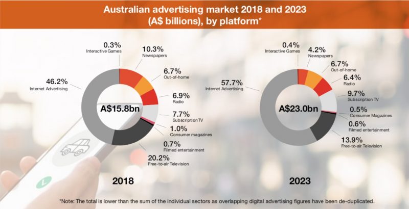 普华永道媒体展望报告警告称,到2023年,澳大利亚广告业的增长将被互联网巨头瓜分