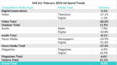 该公司表示下降在很大程度上是由于政府的支出下降50%,与2022年2月的广播也受益于北京冬季奥运会。删除政府类别预订,潜在的广告支出下降为5.5%。