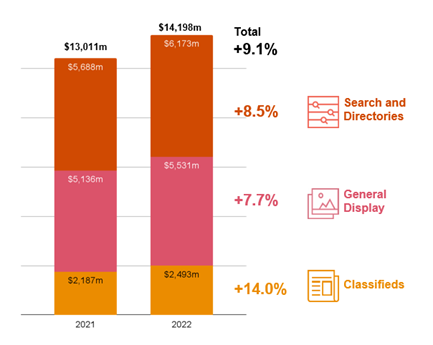 澳大利亚的在线广告支出在2022年达到142亿美元。虽然这一数字同比增长9.1%,但与2021年报告的36%相比有所放缓。