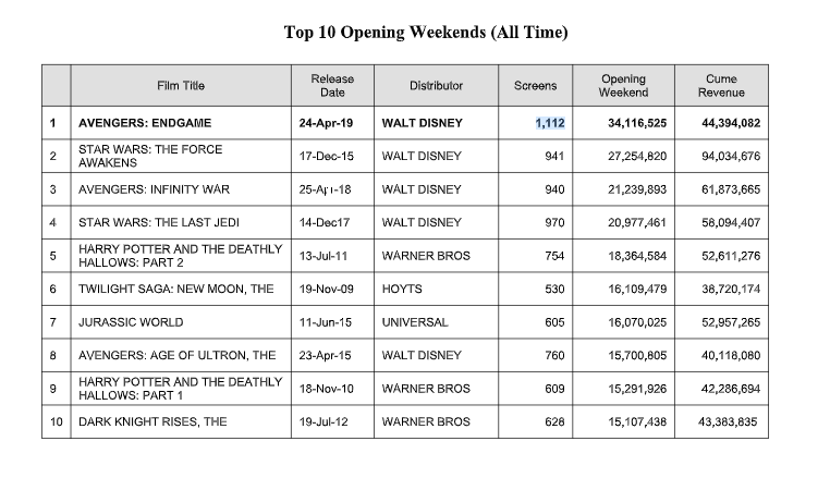 复仇者:结局了澳大利亚与34美元首周末票房纪录