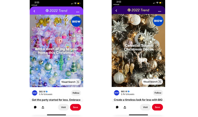 “我们今年的趋势徽章的目标是激励和吸引那些有计划的购物者,展示新的圣诞系列的主要产品。”在2021年我们的最后一次趋势徽章活动取得巨大成功之后,我们很高兴再次与Pinterest合作,这次使用Pinterest预测洞察力。我们选择了这四个主要趋势,因为它们与BIG W最新的圣诞装饰主题最具共鸣,并且非常符合我们目标受众的兴趣。——Stephanie Denman, BIG W的营销经理。